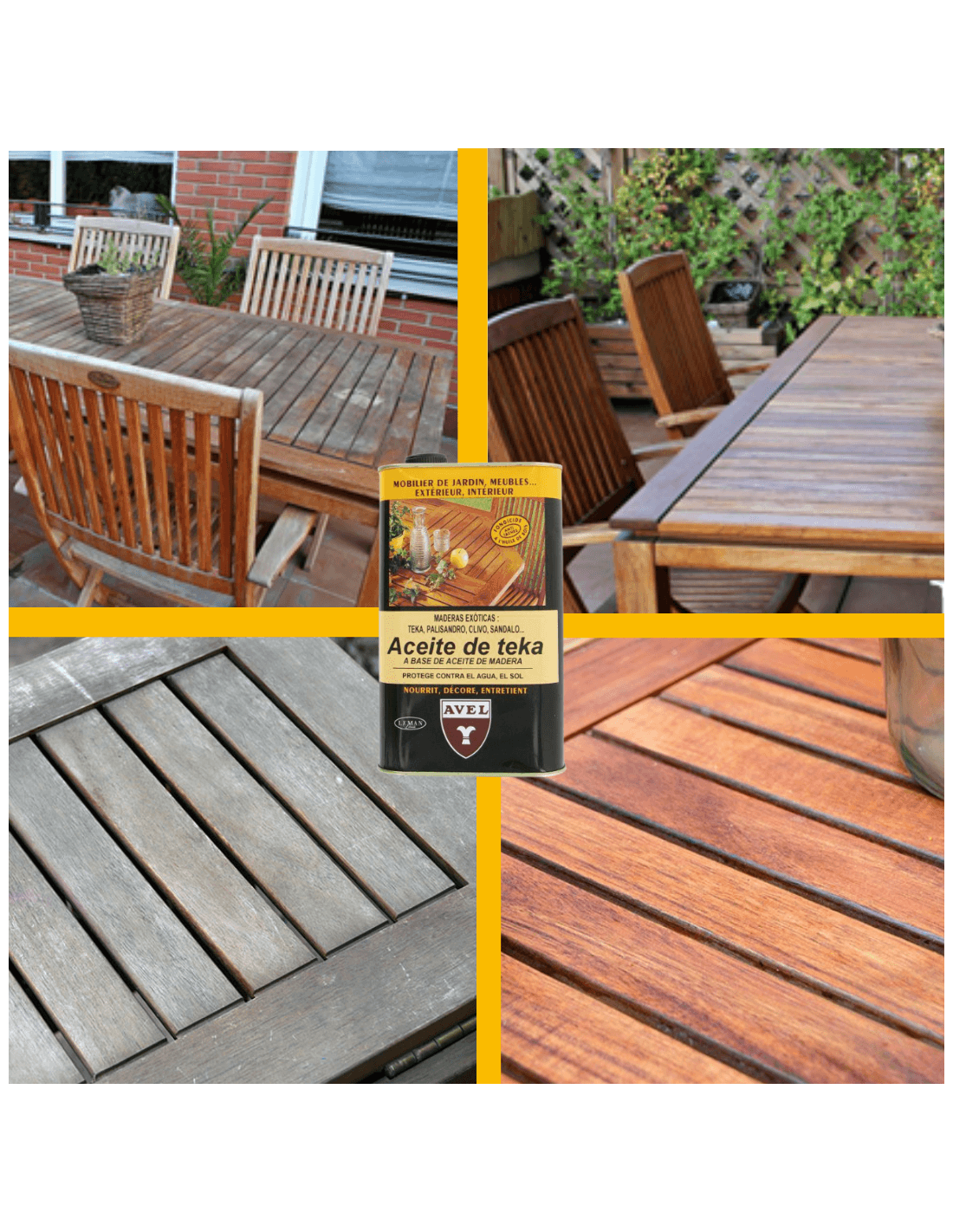 - El Aceite de Teca esta especialmente diseñado para mantener, proteger y decorar la madera de teca tanto de interior como de exterior.