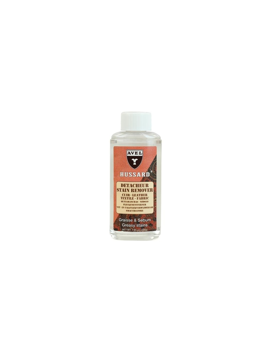 El Quitamanchas Líquido Hussard elimina sobre los cueros lisos las manchas de alquitrán, pintura, chicle, así como las manchas antiguas de cera.
