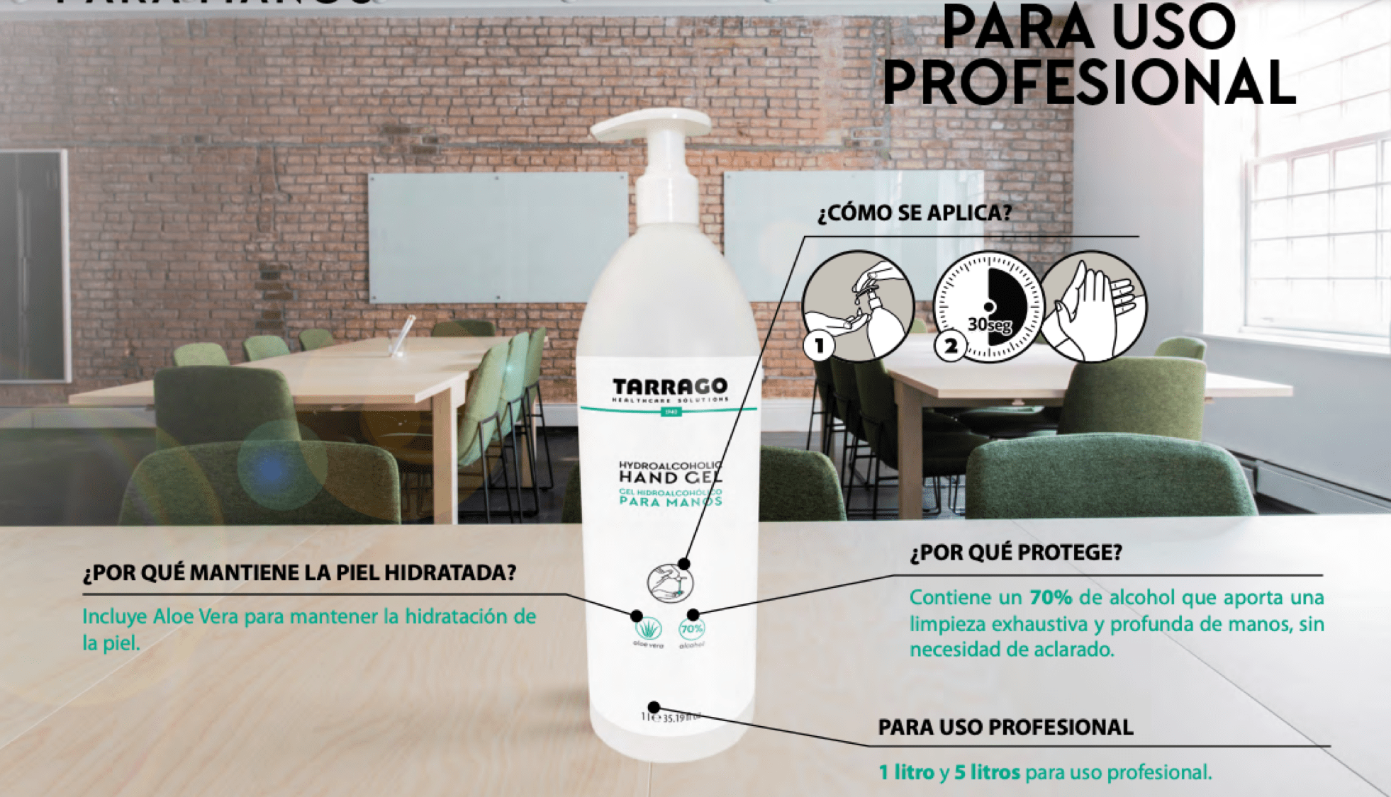 El gel hidroalcohólico Tarrago limpia las manos y proporciona una higiene total. Contenido de alcohol 70%. Es de fácil uso, y no necesita aclarado con agua. Está disponible en formato 115ml y 120 ml, ideal para llevarlo contigo a cualquier parte, y en formato de 1 litro y 5 litros para uso profesional.