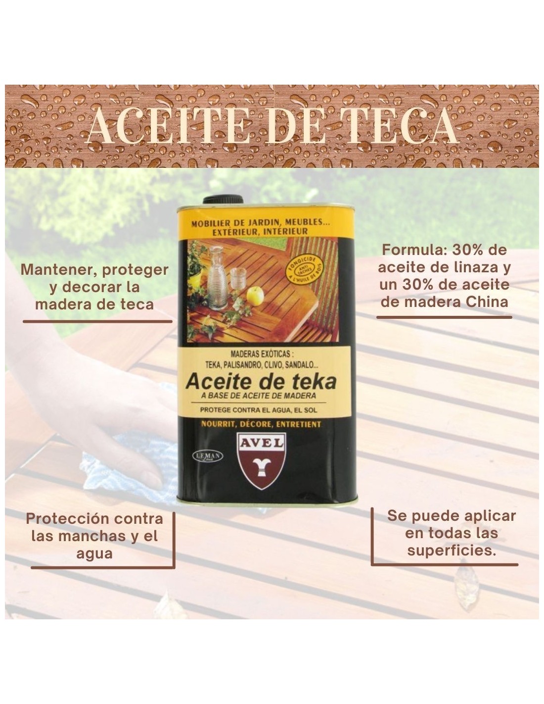 O óleo de teca é um óleo para madeira de teca composto de óleo de linhaça e óleo de madeira chinesa, uma mistura que consegue impregnar a madeira para nutri-la e protegê-la de agentes externos como sujeira, manchas e água.