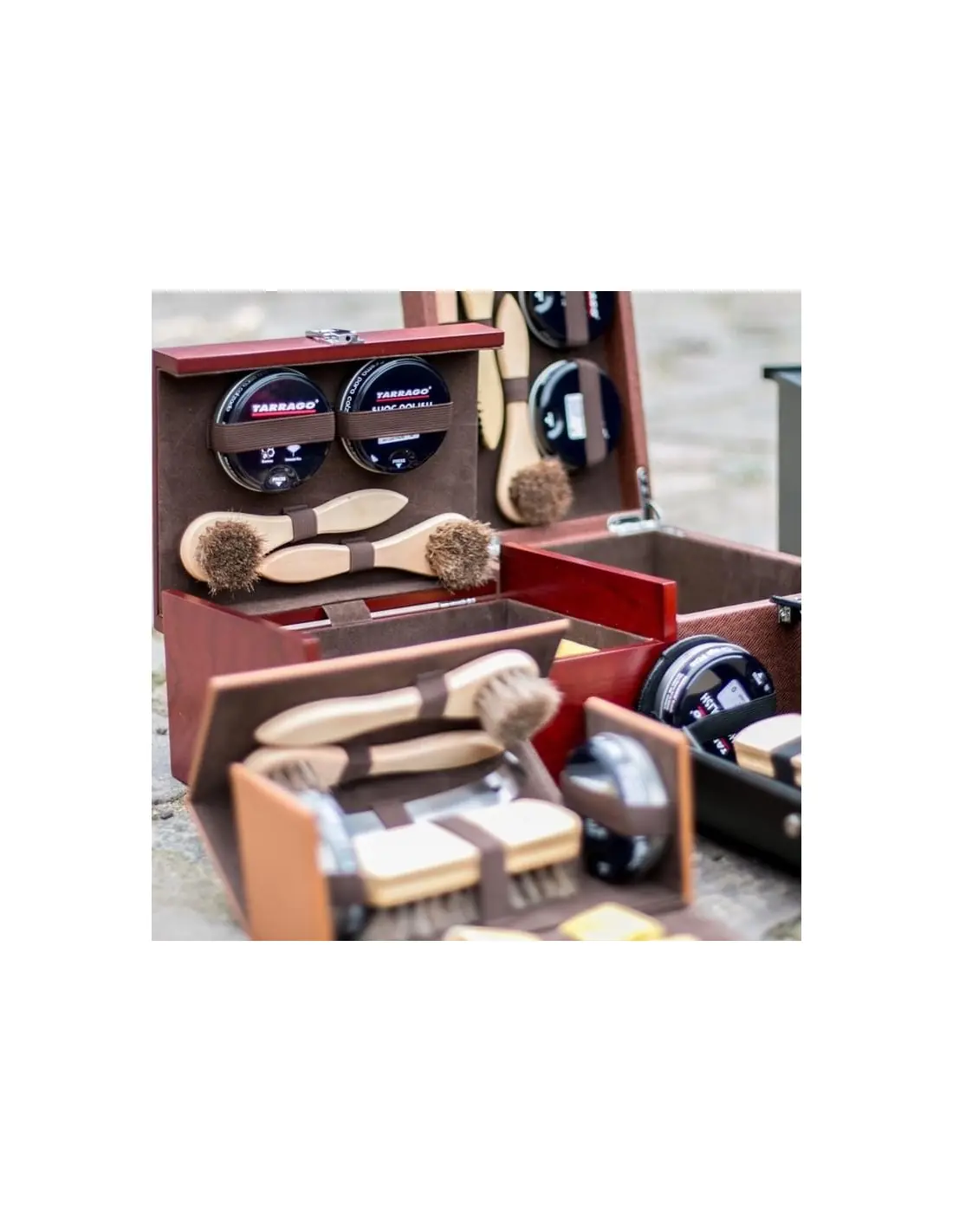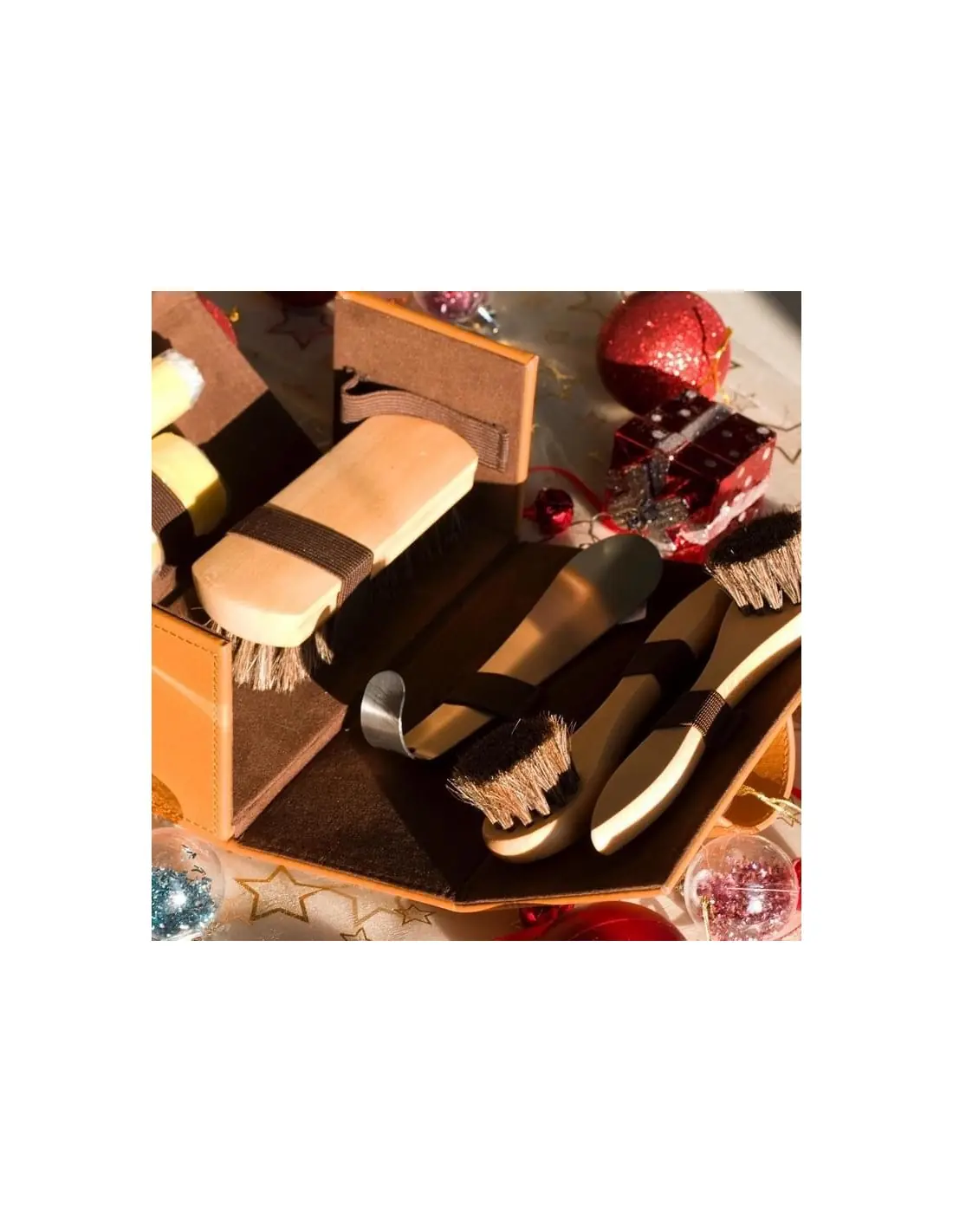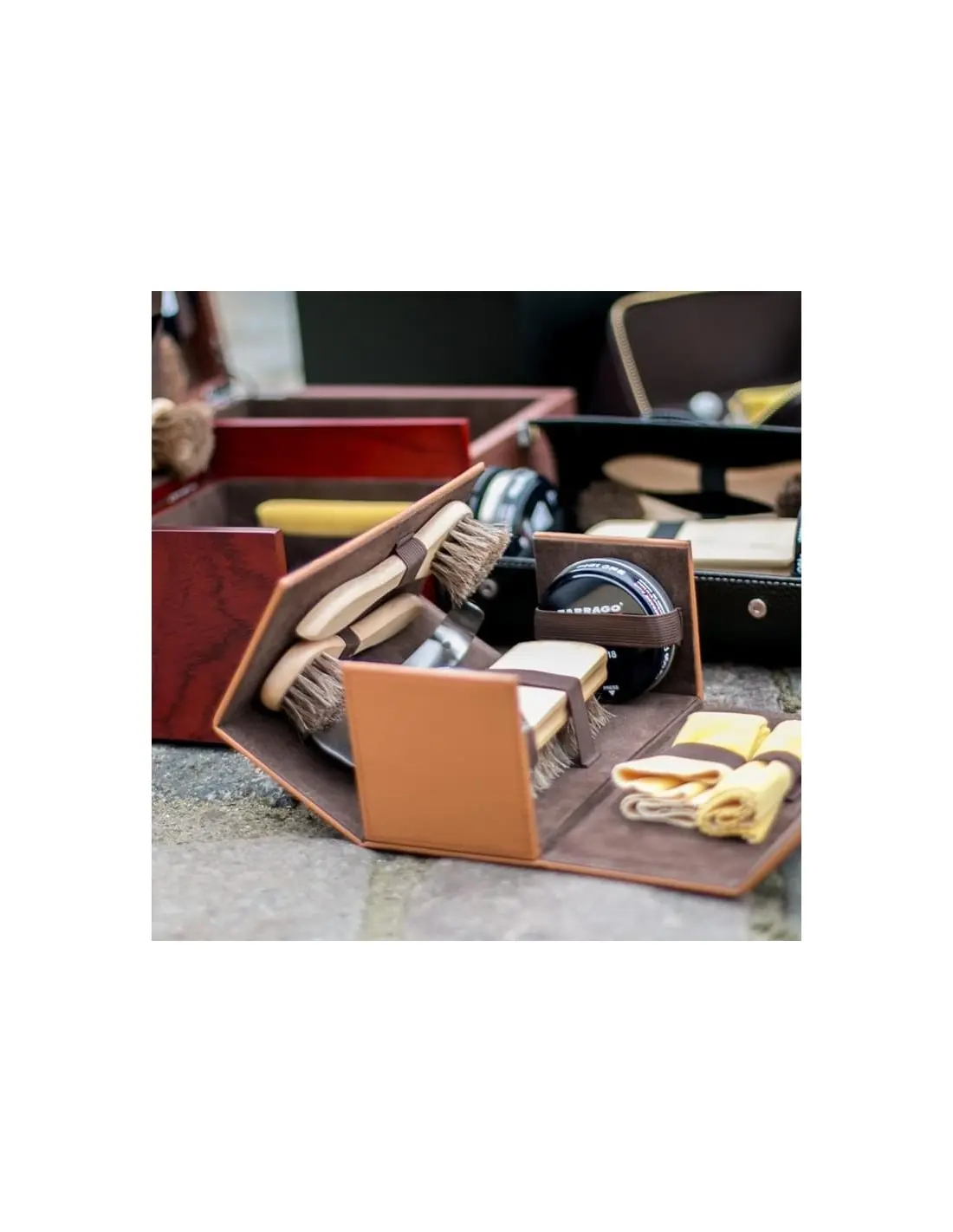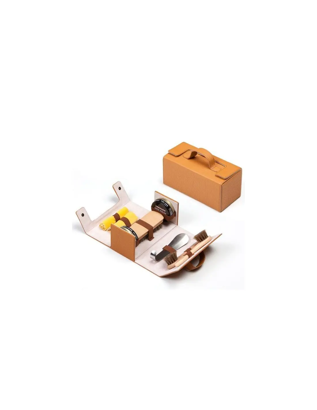 Kit de viagem prática e elegante para a limpeza básica de calçado. Caso de alta qualidade, réplica de couro natural impressão. Marrom Claro conteúdo: 1 ESCOVA DE MADEIRA POLISH 2 ESCOVA EXTENDER COM CABO DE MADEIRA1 CAMURÇA1 LUVA POLIMENTO1 CALÇADEIRA METAL 2 SHOE POLISH TARRAGÓ 50 MLTamanho: 21 x 10 x 10,5 cms
