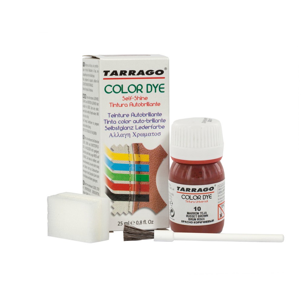 Tinta couro Tarrago Color Dye, ideal para restaurar, renovar ou mudar a cor de couro liso, polipele e materiais sintéticos. Cobertura total e duradoura.